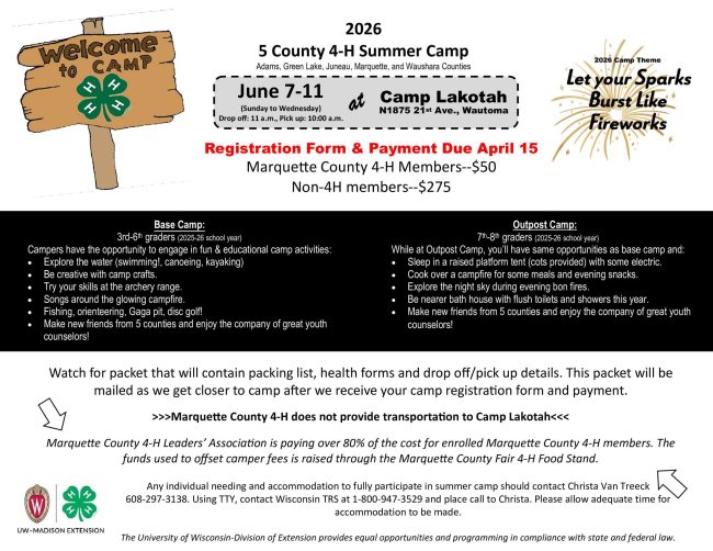 Marquette County 4‑H members attend for just $50, thanks to support from the 4‑H Leaders’ Association and the county fair food stand.