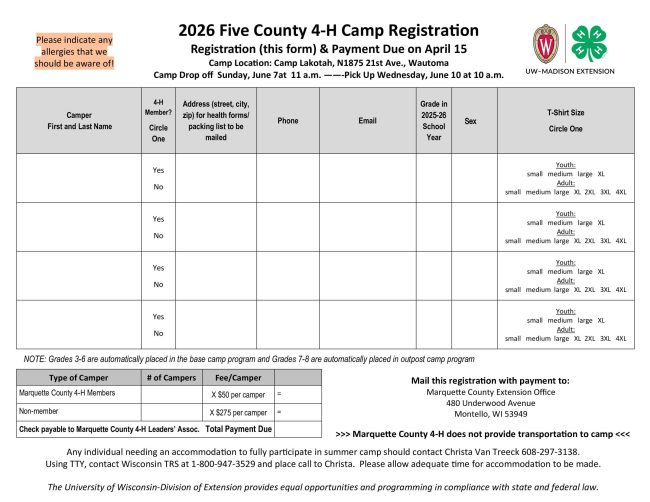 Forms may be mailed to the Marquette County Extension Office